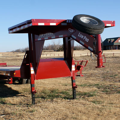 Red Rhino™ 32 foot, 10K Low Pro with five foot ramps, pop-up center, LED lights and spare tire mounted.